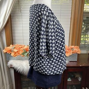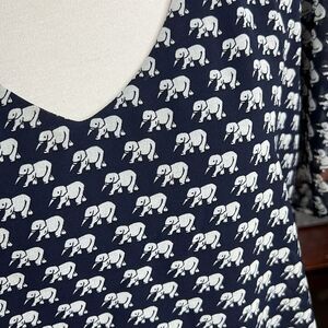 This adorable white elephant print pop. An invisible zipper down the back stops at the waistline, where a band of classic navy ponte twill nips the waistline for a whimsical and flattering look. With its V-neckline, cap sleeves, and figure-loving fit, the Parade Blouse is easily one of the most flattering tops in the collection.
