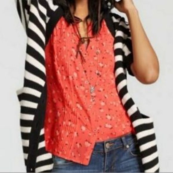 The notched V-neckline buttons all the way to the waistline and pintucks on each side of the placket create tiny little pleats, elevating the feminine feel of this delicate blouse. Blossom print V-neck, pintucks, and button front.