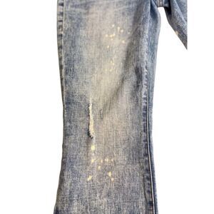 Features: Acid washed skinny jeans with allover distressing and bleach splatters. Zip fly, mid/high rise, cinched in waistband for a flattering silhouette you're going to love.