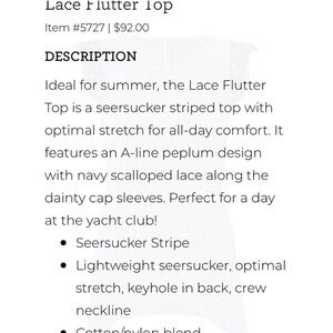 CAbi #5727 Olivia Lace Flutter Top in Blue Seersucker Stripe. Size small. Cap sleeves with lace trim. Peplum style. Keyhole back with button closure. Retailed for $92. Pre-owned, great used condition.