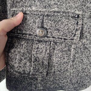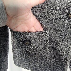 This CAbi 629 women's coat is a classic equestrian style jacket made from a wool blend tweed fabric. The gray color and herringbone pattern make it suitable for a variety of occasions including travel, casual wear, workwear, and business attire. The jacket features long sleeves, button closure, and shoulder pads for added structure. This jacket is a size 8 and is dry clean only. Perfect for the fall and winter season, this coat is sure to make a statement wherever you go.