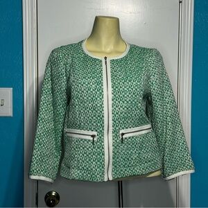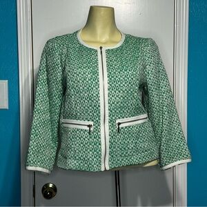 CAbi “726 Clover Tweed Jacket” green & white 3/4 cropped 2 zippered pocket 6