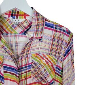 CAbi #797 Plaid Cirque Blouse Roll-Tab Sleeves Shirt. 100% rayon. Patch breast pockets.