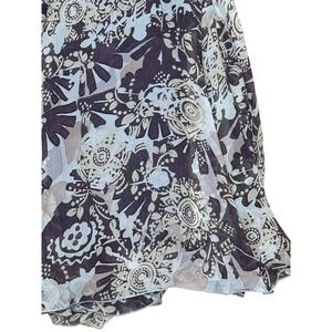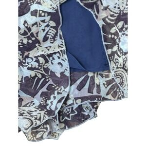 Flowy and feminine CAbi maxi skirt, style #932, in a size small. This twirly circle skirt features a brown and beige abstract pattern, full silky lining, and an elastic waistband for comfort. Lightweight and perfect for boho, vacation, or casual wear.