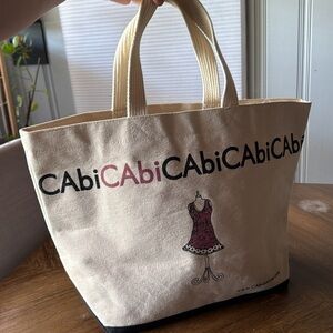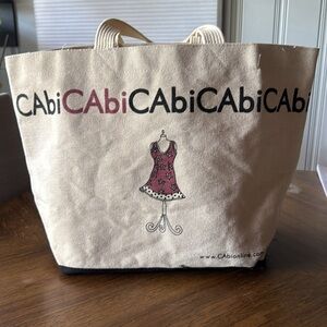 Chic CAbi tote with bold graphic design. Beige canvas with black accents. Ideal for daily essentials. Has some spots.