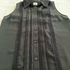 CAbi Black Button Up Sleeveless Jagger Blouse with Crochet/Lace Inserts Size XS