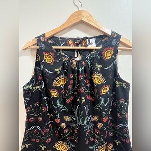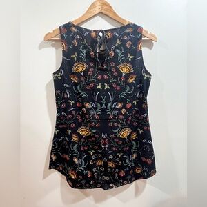 This stylish CAbi blouse features plants and floral designs on a black background. Cute tie in the back. Size S. The sleeveless style offers a modern and versatile look, perfect for any occasion. Its fitted silhouette and balanced floral pattern add a touch of elegance to your wardrobe.