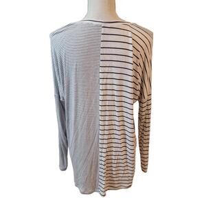 Cabi #3806 Pivot tee. Black and heathered white stripe details. Mixed patchwork look. Oversized, tunic length. Scoop neckline, tapered long sleeves. High low hem. Lightweight t-shirt jersey knit. Super soft, drapey fabric that is perfect for a front tuck. 97% rayon, 3% spandex.