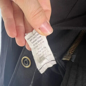 Slanted front zip with gold snaps, zippered front pocket, 1 faux pocket, soft, long sleeve, snap tabs on back, padded shoulders, gold hardware
