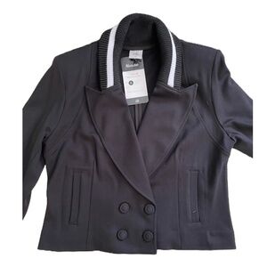 Meet the jacket that means business and brings the party — the CAbi Black Tie Jacket is your not-so-basic black blazer with a major twist. This cropped beauty is double-breasted and drama-ready, featuring bold lapels, a sporty striped knit collar, and tailored seams that flatter in all the right places.
