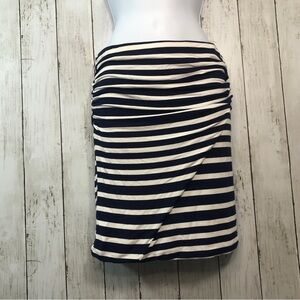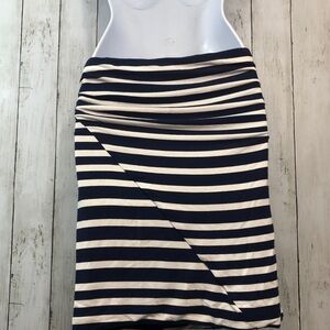 Navy blue and white stripes, strapless, elastic above bust, soft and stretchy, jersey feel, diagonal pattern, ruching on side or turn to have a versatile look, super cute as a mini skirt, colors may vary due to lighting, good used condition, small
