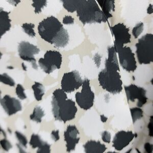 Cabi size small leopard print wrap blouse with a peplum and ruched sleeves. White back ground with black and tan spots.
