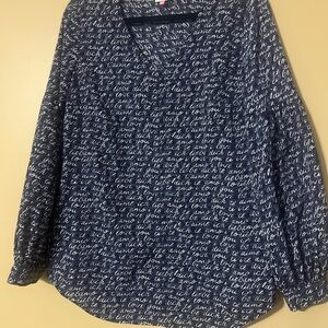 This CAbi blouse showcases a relaxed fit in a deep blue hue, highlighted by a notched collar and buttoned front. Its effortless style is perfect for any occasion, combining elegance with comfort. Bust 21 lengths 29 sleeves 25