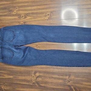 These CAbi skinny jeans in a rich blue hue feature a modern tapered fit with intentional distressing for a trendy, casual look. The medium-to-dark wash adds depth, while the subtle fading enhances their stylish appeal.