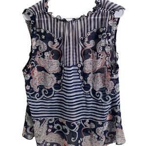 CAbi Blue Tan Sleeveless Pleated Ruffled Blouse