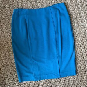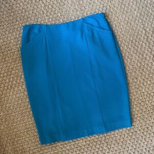 Sigourney Pencil skirt in bright teal color. Two slash pockets on front that look like a design element. Back of skirt has two slits for movement that havent had the threads cut yet. 75% rayon, 22% nylon, 3% spandex. Style #3220 Size 4. In excellent condition. Please see photos for wear and measurements.