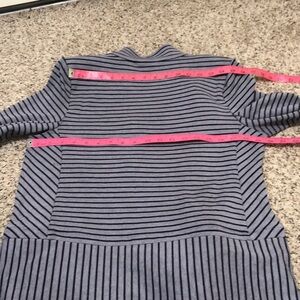 Excellent condition no stains rips or fading. Long sleeve, hidden button front, stand funnel neck, unlined jacket. Dusty blue and navy blue stripes.