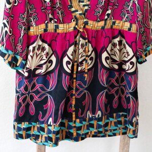 CAbi Chelsea Tunic SzL Colorful 100% Silk Babydoll Empire Waist Tie 3/4 Sleeve
