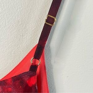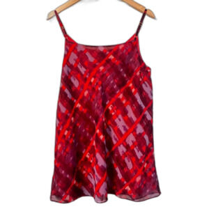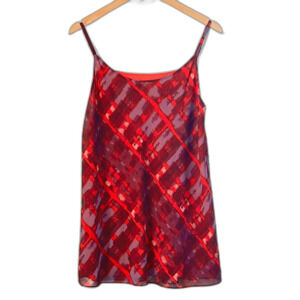 Lined camisole with adjustable spaghetti straps and a red and purple abstract or watercolor-type print.