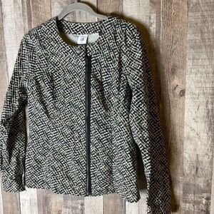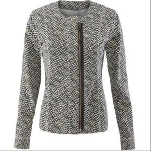 Multi-colored motto style jacket. Enough stretch for all day comfort. Zip and snap closure with angled, front pockets.