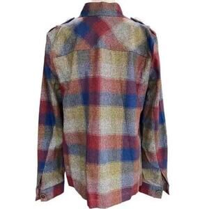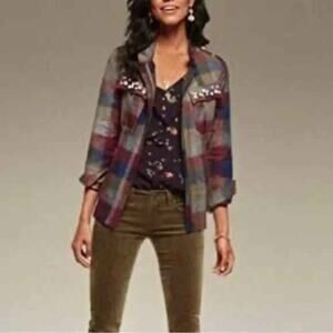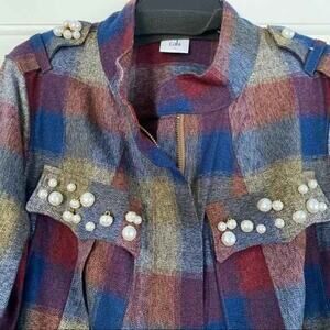 Cabi College Plaid Shacket Jacket, Size M. Beautiful pearl button embellishments on barn "shacket". Functional flap front pockets on chest, side pockets at waist, buttons on cuffs and full zip front closure. Approx 20" armpit to armpit, 25" shoulder to hem and 25" sleeves. 100% cotton