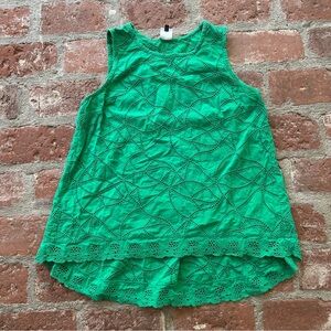 CAbi Cottagecore Gemma Green Eyelet Blouse Sleeveless Tank Top 5036 size medium Embrace a relaxed and stylish look with the CAbi Green Asymmetrical Tank Top. This vibrant green top features a sleeveless design and an asymmetrical hemline, perfect for a casual summer day. The light and airy fabric ensures comfort, while the unique cut adds a touch of modern flair to your wardrobe. See photos for approximate measurements. In good used condition. See photos of under arms, some minor wear.
