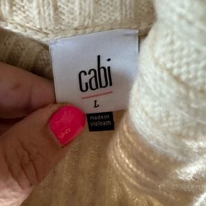 Embrace the cozy elegance of this CAbi sweater, featuring a luxurious cream color and a chic cowl neckline. Crafted from a thick, knitted material, it offers a snug fit and long sleeves for ultimate comfort. The tight, uniform stitch pattern adds a touch of sophistication to this wardrobe essential.