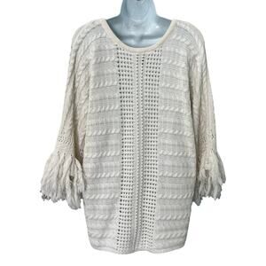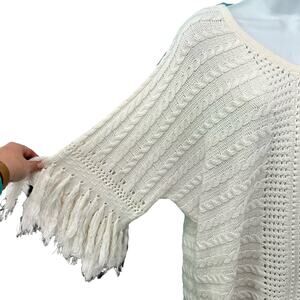 CAbi Cream Ivory Fringe Fiesta Poncho Open Knit Half Sleeve Sweater Top size M
