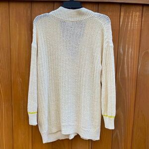 This medium-weight easy easy-fitting pullover has slightly dropped shoulders and 3/4 length sleeves with a neon yellow stripe at the cuffs. Wide and low V-neckline and hits at the high hip. High-end designers are doing these artisanal, homemade knitted pieces. Perfect for the beach!