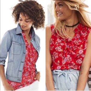 Cabi crush ruffle floral sleeveless top. Elevate your style with this CAbi blouse, showcasing a vibrant red hue adorned with multi-color floral patterns. The sleeveless design makes it an ideal choice for warm weather, while the V-neckline adds a touch of elegance. Perfect for casual outings, this top combines comfort and chic effortlessly. Gently worn once. No rips holes or stains.