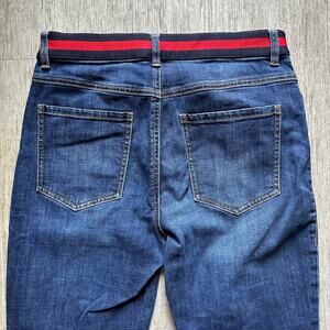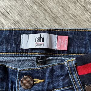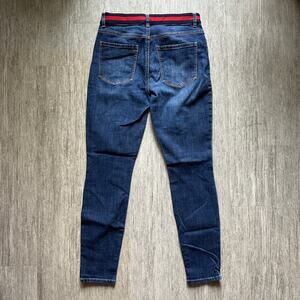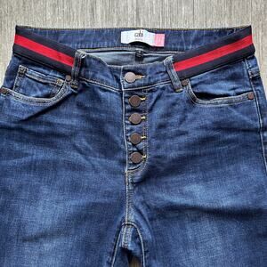 CAbi Dark Wash Mid-Rise Navy/Red Waistband Button Fly Skinny Denim Jeans Size 8