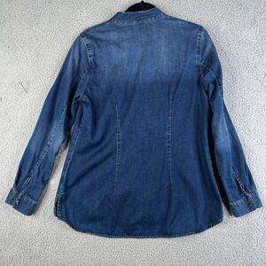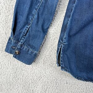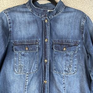 CAbi Denim Blouse Womens M Blue Chambray Flap Pockets Button High Low Waterfront