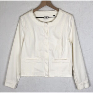 CAbi Denim Jacket Women's Sz M White Frayed Trim Snap Front Pockets Stretch