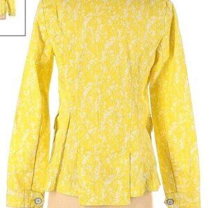 This is a CAbi Field Jacket in size Small for women, featuring a yellow floral print with daisies. Made from a cotton blend canvas fabric, it has a button closure, long sleeves, and a mid-length silhouette. The jacket is unlined, lightweight, and breathable, making it suitable for all seasons. It has a point collar, pleated accents, and pockets. The floral design gives a vibrant and summery touch to the blazer-style jacket. Arm to arm: 18 inches. Length: 23.5 inches. Adorable for Spring