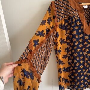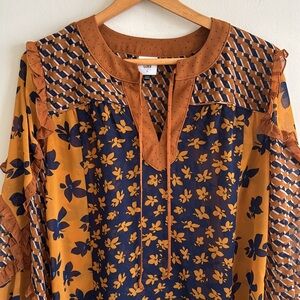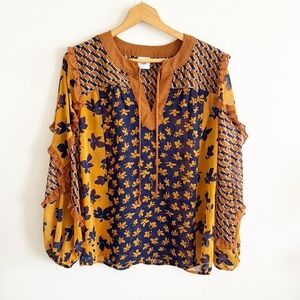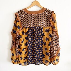 CAbi #3953 Golden Eye Harmony Blouse in Flower Riot print. Mustard/gold and blue. Size small but loose fit that could also fit a medium. Long sleeves with ruffles. Tie at neck. Retailed for $99. Pre-owned, excellent condition with no flaws.