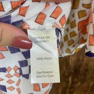 features | collared neckline, button down front, three quarter sleeves, breast pockets, geometric print, lightweight challis fabric