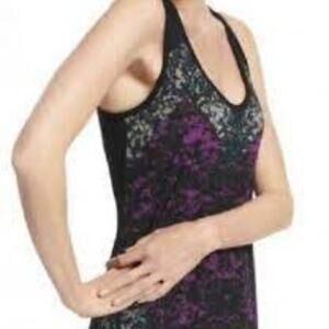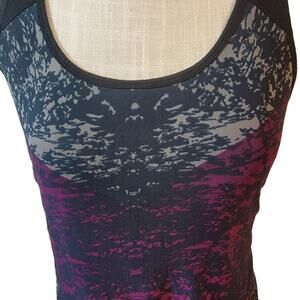 This is a beautiful tunic tank from CAbi. Features a black and purple color, with a mesh overlay in the front. Tank can be worn alone or under open shirt or jacket for a layered style. In fantastic condition!