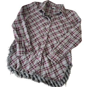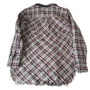 CAbi Highland Flannel Plaid Gray and Purple Button Up Frayed Hem Shirt Size S