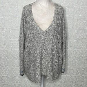 Oversized V-neck pullover sweater, drop shoulders with skinny sleeves, cable knit pattern with pointelle holes.