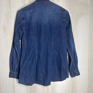 Chic indigo blouse by CAbi. Features button-up design and dual chest pockets. Ideal for everyday style.