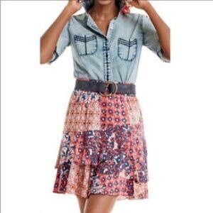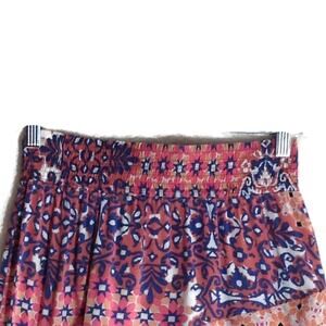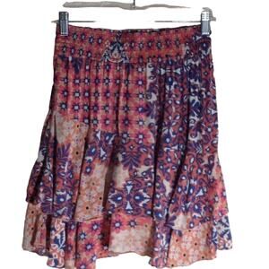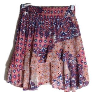 CAbi Isabel Patwork Boho Mini Skirt XS Pink Purple Asymmetrical Tiered Ruffled