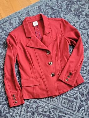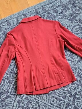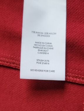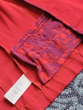 Like new condition in a DARK red, not the bright red in the photos. Fitted with a good amount of stretch. Functional front pockets. No snags or stains. Approx. 17" armpit to armpit laying flat, 22" back neckline to hem. From a smoke-free home. Questions? Just ask!