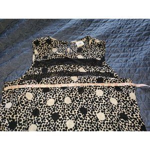 Solid white fabric with black and white mixed polka dot pattern throughout. Pullover sleeveless style with round neckline, lace strip details and metal button closure in back with keyhole opening