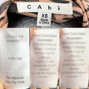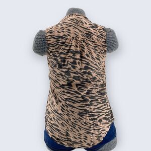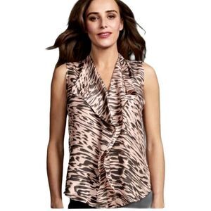 CAbi Just So Animal Print Tan Zebra Stripe Silk Ruffle Sleeveless Blouse, style 104, size XS. Dolphin hem. The tan color is kinda peachy. This fabric doesn't stretch. Excellent used condition.