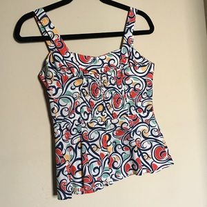 Adorable CAbi vintage inspired tank to wear alone or layered. Inspired by a 1940s bathing costume. Tailoring details include back zipper set into elasticized smocking, gathering at front bodice and set into waist creating and hourglass shape. Adjustable straps.contrast piping shows off front flap at bodice. Machine wash cold on delicate. Tumble dry low. 100% cotton. Excellent used condition. Only worn a handful of times. No flaws to report.