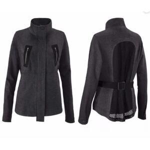 CABI #3184 Love Carol Jacket Ponte Knit Belted Mesh Back Heathered Gray. Utility style. Fishnet mesh back. Exposed jersey lining. Adjustable belt in the back. Hidden front zipper. Lots of pockets.