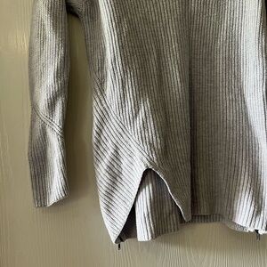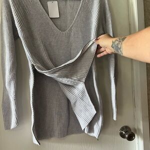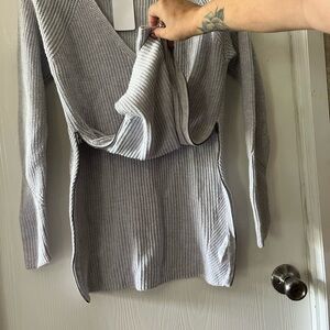 Size small in EUC Grey/blue sweater with side zippers. CAbi style #3531, Fall 2018 collection.