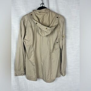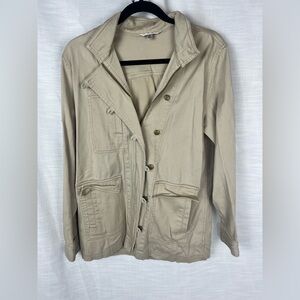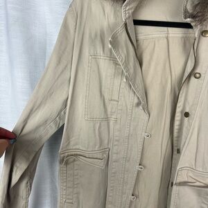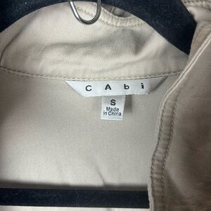 Chic CAbi jacket in light tan. Great for fall. Removable faux fur hood