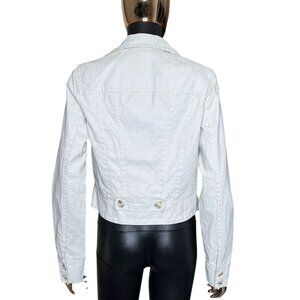 This Cabi 100% linen ruffle jacket (Style #325) is the perfect lightweight layering piece with timeless sophistication. Made from breathable linen in a soft beige oatmeal hue, it features a flattering asymmetrical hemline, double-button front closure, and playful cascading ruffle detailing. Front flap pockets and button accents add a tailored yet romantic finish.