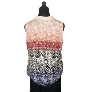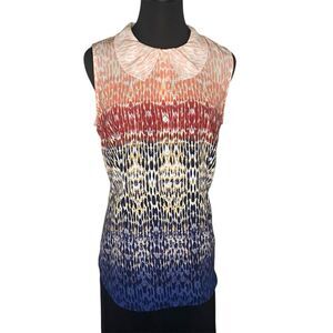 Lightweight sleeveless blouse from CAbi in elegant multicolor design featuring Peter Pan collar. Excellent preowned condition, women's size medium.